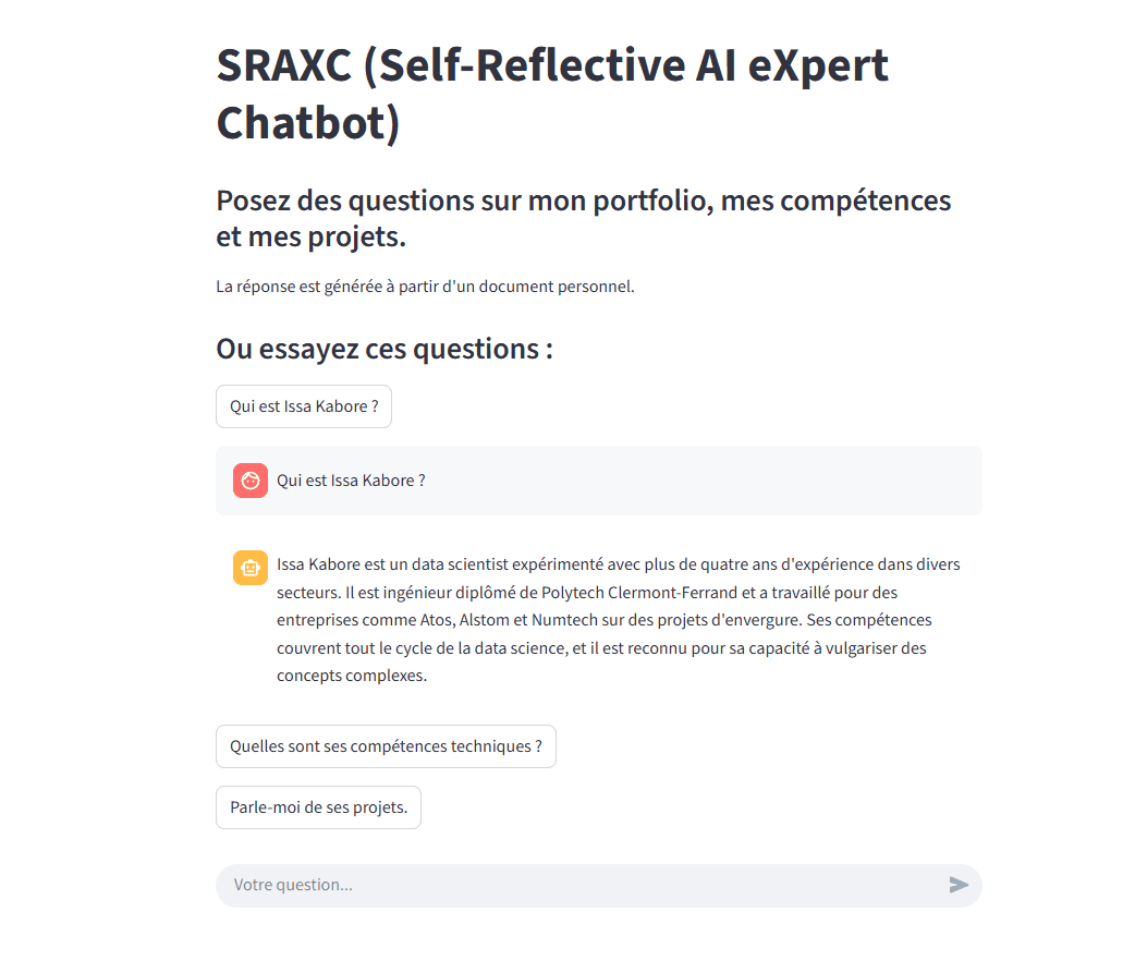SRAXC (Self-Reflective AI eXpert Chatbot) est une application web que j'ai conçue pour permettre aux recruteurs et aux entreprises de découvrir mon profil de manière interactive et dynamique. Au lieu de simplement lire mon portfolio, vous pouvez lui poser directement des questions sur mes compétences, mes projets, mon parcours professionnel et même mes loisirs.