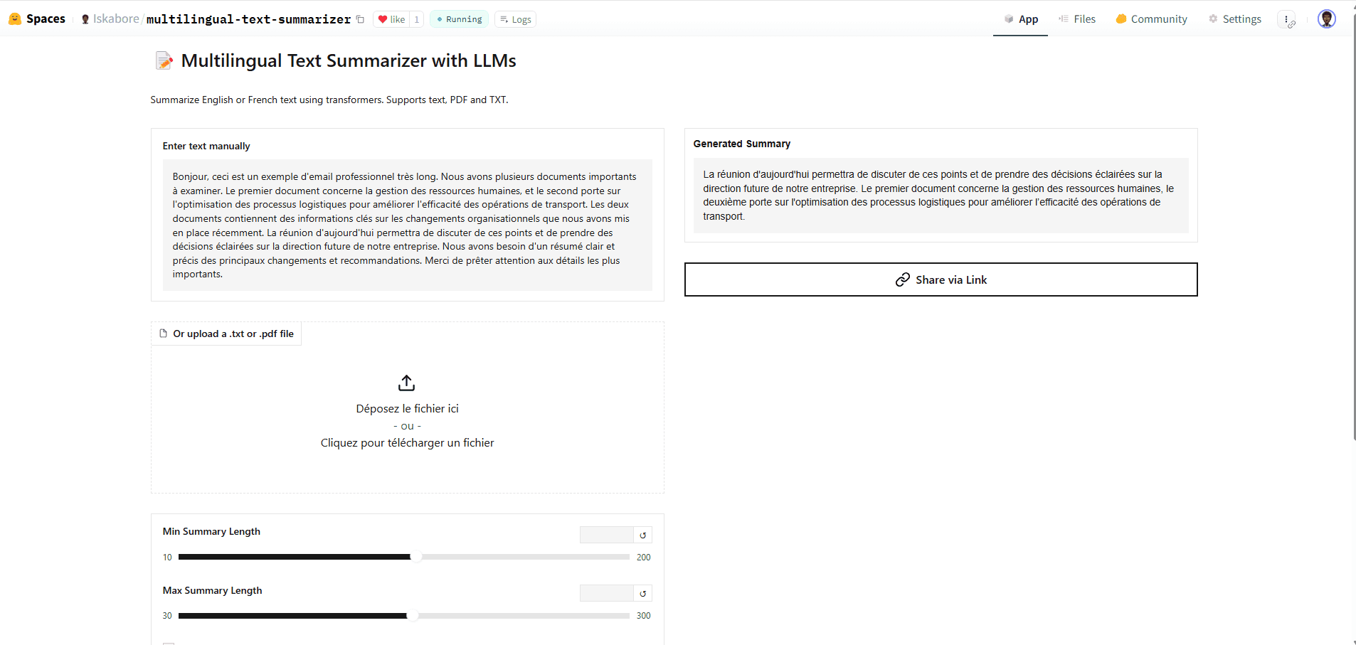 J'ai développé une application web complète qui utilise des modèles de la bibliothèque Transformers (BART, T5) pour la synthèse de texte. L'application gère une variété de formats d'entrée, y compris le texte direct, les fichiers .txt et .pdf, et intègre une détection automatique de la langue. Une interface conviviale a été construite avec Gradio pour une interaction simple et intuitive.